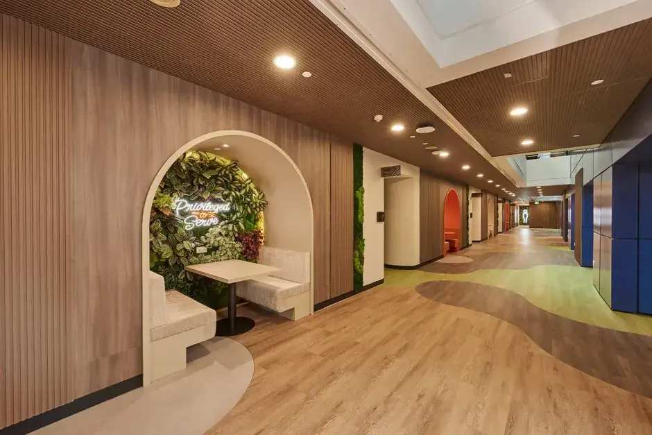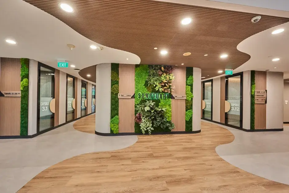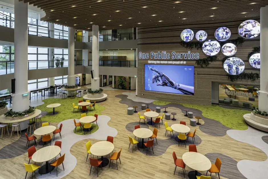 The Civil Service College Learning Oasis reimagines a utilitarian space into an inspiring hub for Singapore’s public officers. Featuring biophilic and zen elements, it offers flexible learning areas, quiet zones, and collaborative spaces. Sustainability is prioritised by preserving key architectural features, maximising natural light, and using energy-efficient systems.