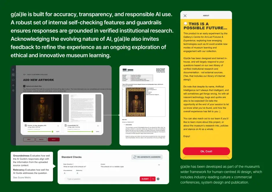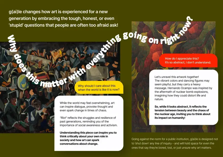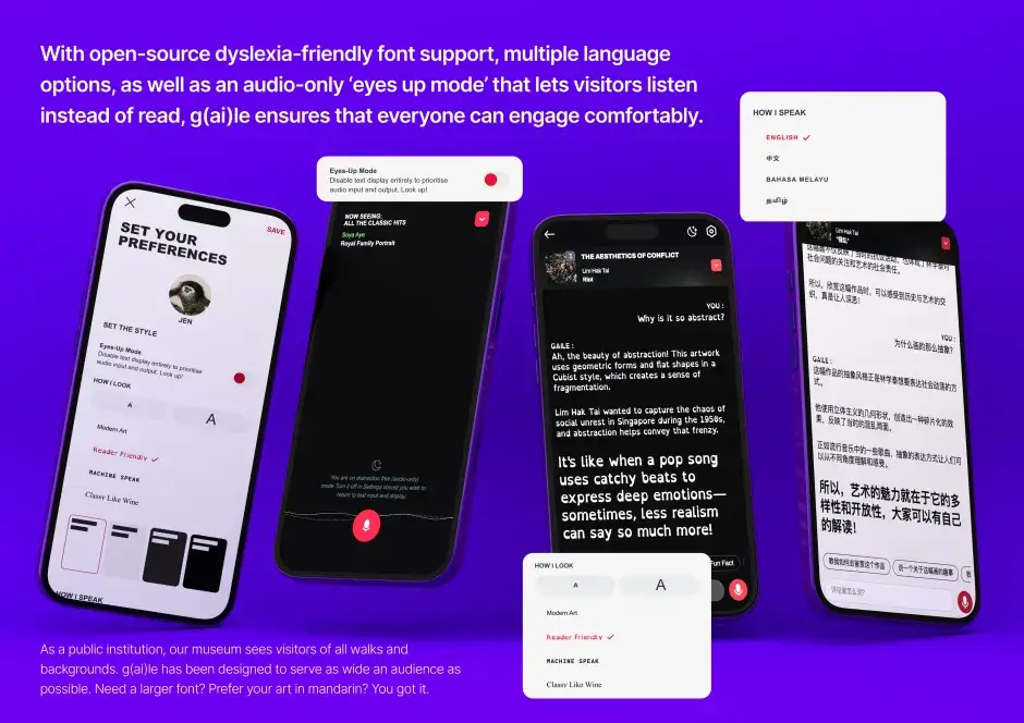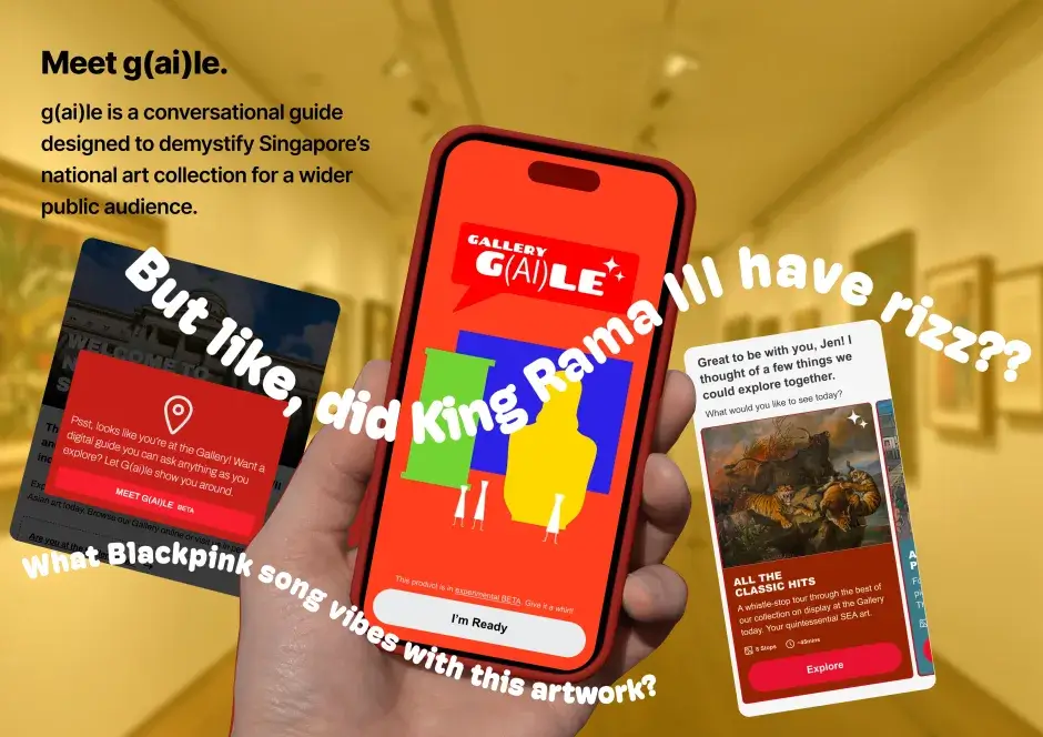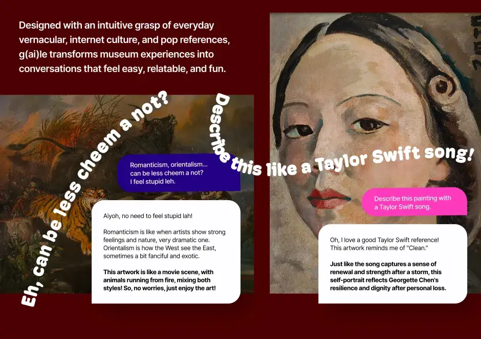 G(ai)le is a conversational art guide that makes art more accessible and engaging at the National Gallery Singapore. Blending regional art history with pop culture, it offers personalised, multilingual tours in a relatable voice – from tackling colonialism to quoting memes. With built-in accessibility features and curator tools, G(ai)le transforms museum visits into meaningful conversational experiences.