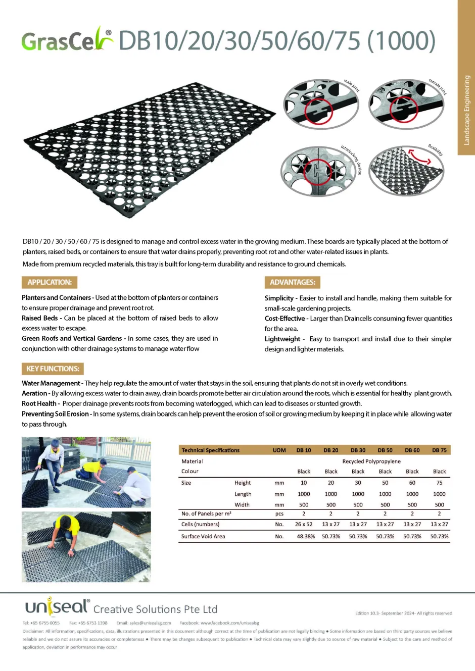 Crafted from recycled materials, the GrasCell DB combines smart water control with sustainable design. Its airy structure promotes root health and prevents water damage, all while adapting to sloped or bumpy grounds. With fewer modules needed to cover large areas and thickness options from 10mm to 75mm, its a versatile, efficient solution for modern green spaces.