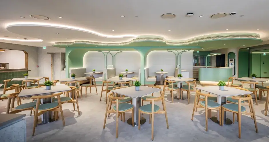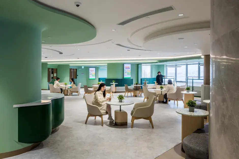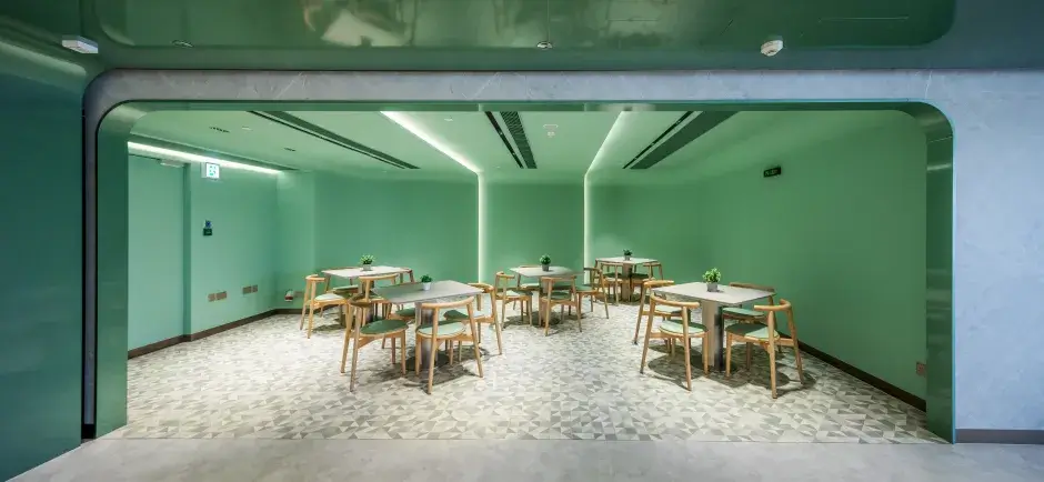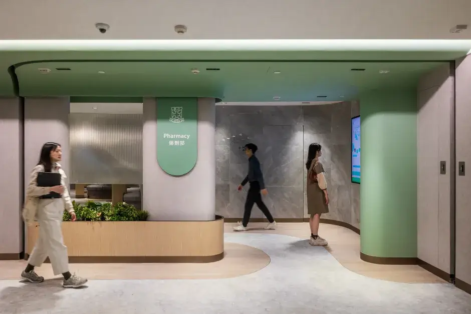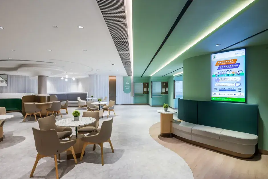 The newly renovated 1,000 sqm staff canteen and pharmacy at Hong Kong Sanatorium & Hospital integrates wellness and sustainability. Completed in early 2024, the space features natural light, green tones, and flexible layouts, promoting a calming environment for both staff and patients.