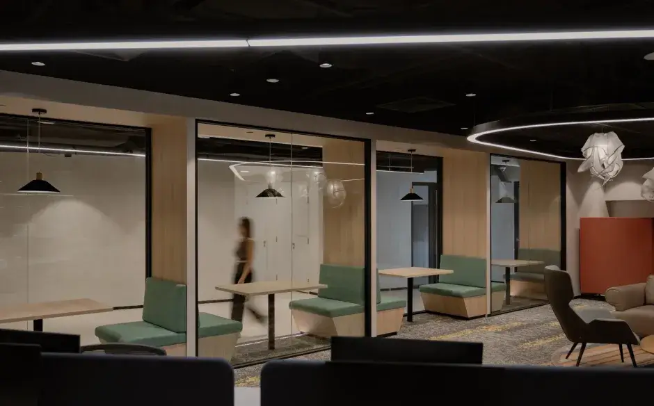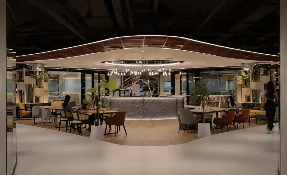 The 40,000 sf Sparks office at NCS Hub is co-working space designed for innovation, featuring tech-enabled workstation, vibrant meeting rooms, and cozy breakout areas. A dome-lit informal zone and unmanned cafeteria enhance collaboration and convenience.