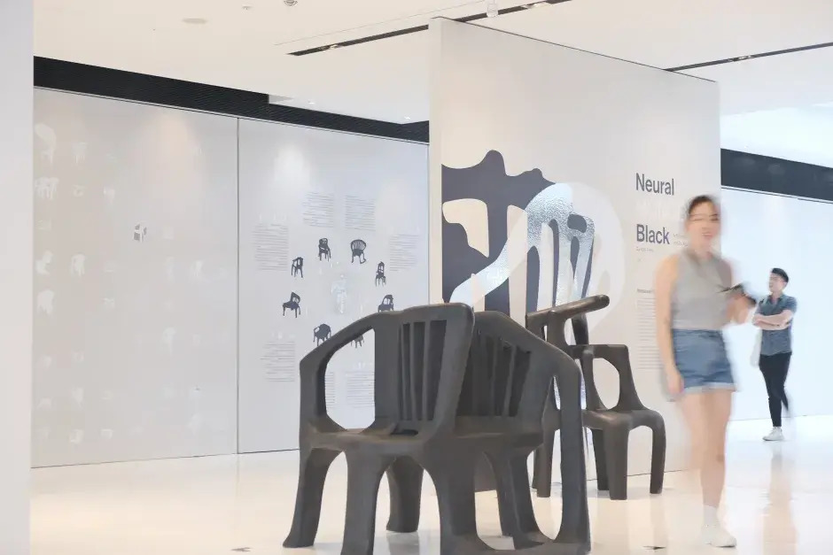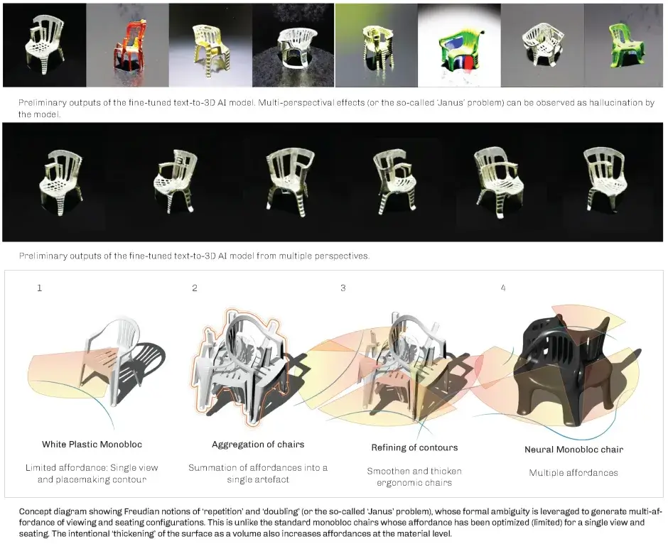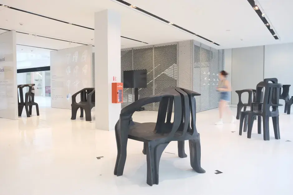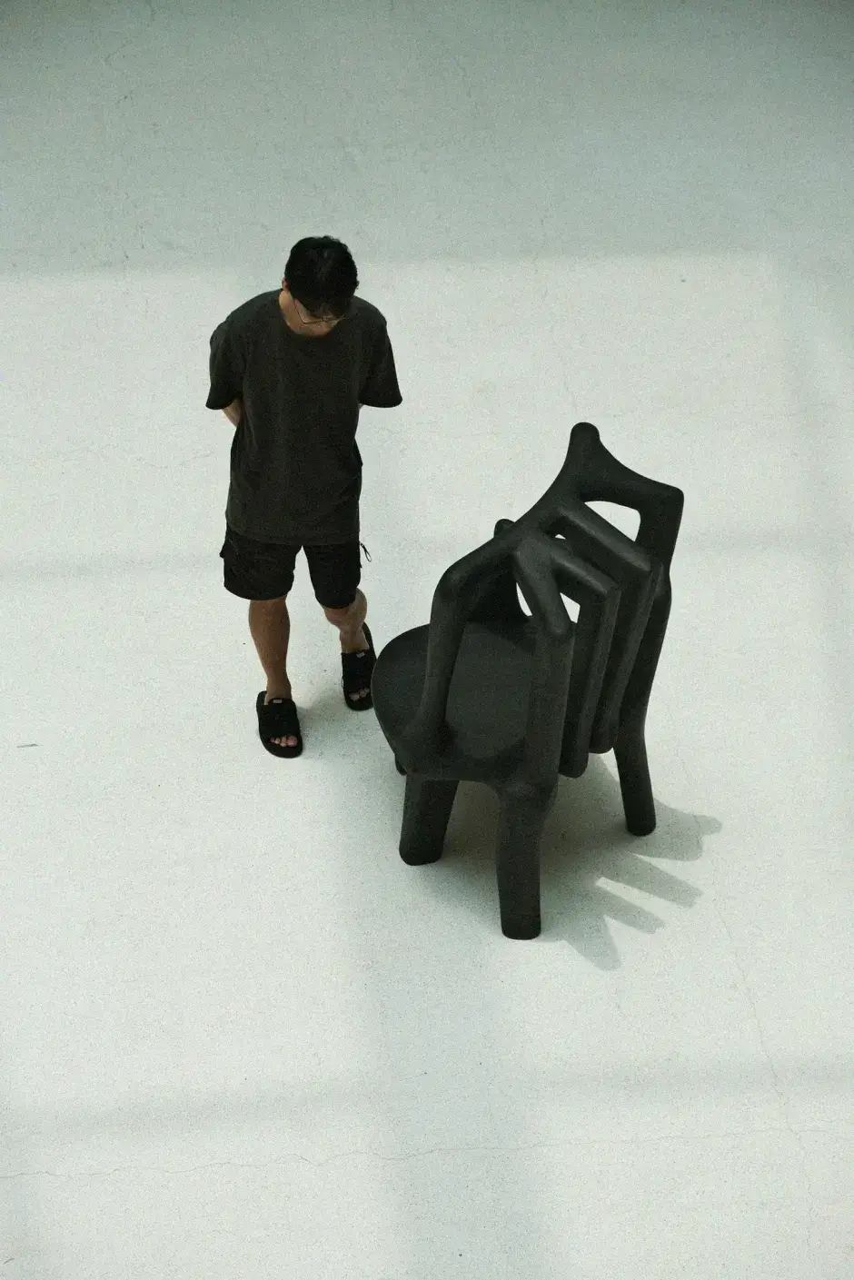 The Neural Monobloc Chair critiques modern design by reinterpreting the ubiquitous plastic Monobloc chair. Using a specialised text-to-3D AI mode, the chairs are crafted from upcycled teak, charred black, with an innovative design that encourages social interaction and enhances spatial circulation. It challenges overconsumption and proposes a new model for combining AI with artisanal work to create meaningful, functional spaces.