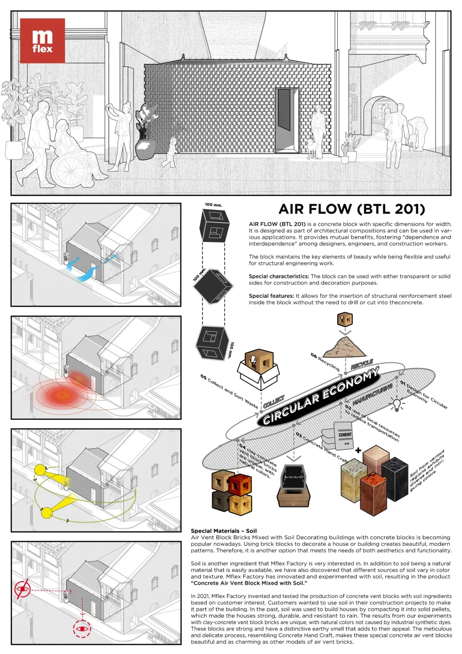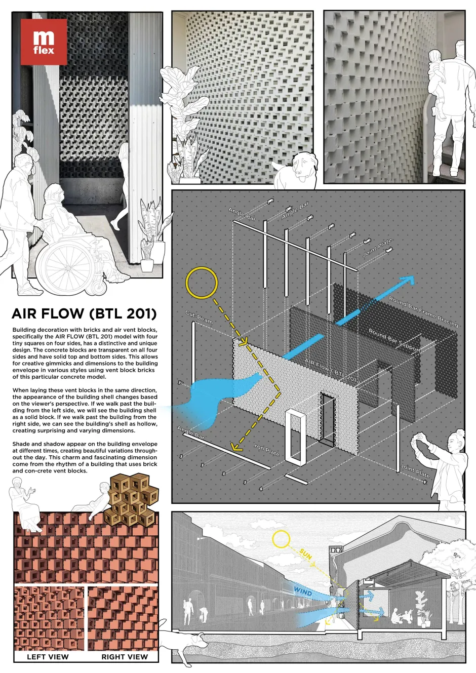 Blending design and durability, Air Flow (BTL201) is a concrete vent block structural function with visual appeal. Designed for easy reinforcements without cutting, it features both transparent and solid faces for flexible use. Made with a soil-concrete mix, it offers natural textures without synthetic dyes. Its four-square design creates shifting light and shadow effects, adding movement and depths to facades.